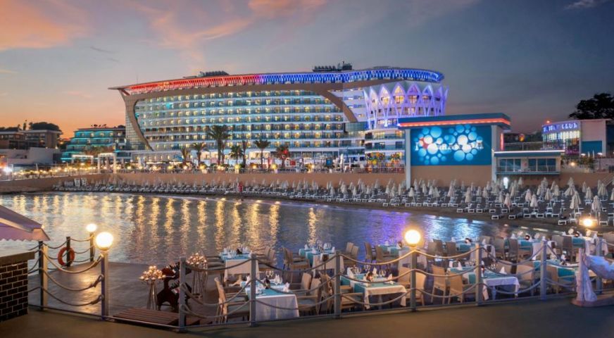 Основен ресторант, 6 а-ла-карт ресторанта (срещу заплащане), сладкарница, 7 бара, дискотека, 3 открити и 1 закрит басейн, 3 водни пързалки, СПА център, магазини, 2 конферентни зали. ЗА ДЕЦАТА: Открит и закрит детски басейн, мини клуб (4-12г.), детска анимация, мини кино, мини диско. БЕЗПЛАТНИ УСЛУГИ: Сауна, турска баня, парна баня, фитнес, аеробика, тенис на маса, 2 тенис корта, дартс, боча, анимация, жива музика, тематични партита, Wi-Fi (в Лоби). ПЛАТЕНИ УСЛУГИ: Масаж, пилинг, фризьор, химическо чистене, лекар, детегледачка, осветление за тенис корт, билярд, боулинг, наем на велосипеди, водни спортове, интернет кафе, рент - а кар. ПЛАЖ: Собствен, платформа (4500 m2). Чадъри, шезлонги и матраци на плажа и при басейна - безплатно. Плажни кърпи – срещу депозит.