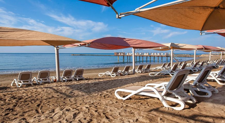 Собствен, пясъченo-чакълен. Чадъри и шезлонги на плажа и при басейна - безплатно. Плажни кърпи - безплатно.