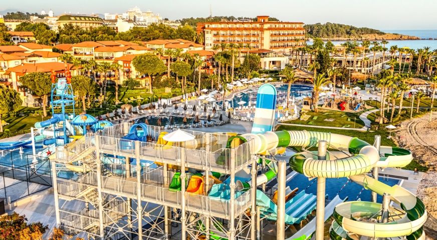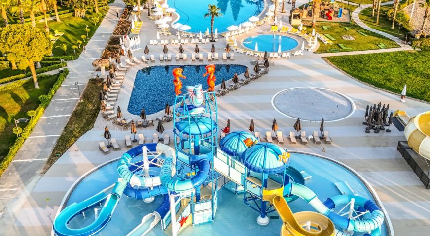 Основен ресторант, 3 а-ла-карт ресторанта (турски, италиански, средиземноморски - с предварителна резервация, съгласно концепцията на хотела), 5 бара, 3 открити и 1 закрит басейн, водни пързалки, амфитеатър, дискотека, СПА център, магазини, 3 конферентни зали, паркинг.