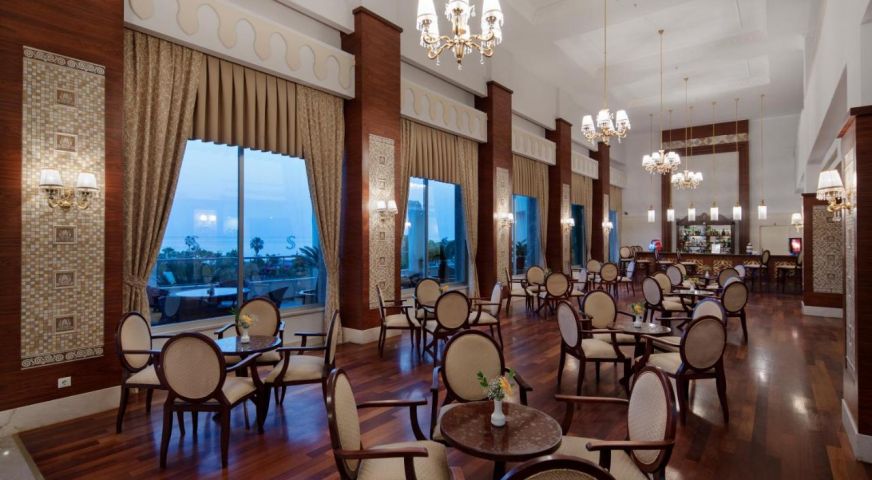 Основен ресторант, 2 а - ла - карт ресторанта, 6 бара, 3 басейна, аквапарк. За децата: детски басейн, аквапарк, анимация Безплатни услуги: сауна, турска баня, фитнес, аеробика, мини клуб, мини - футбол, дискотека - напитки платено, безжичен интернет в лоби бар, баскетбол, сейф, дартс. Платени услуги: масаж, детегледачка, осветление тенис корт, билярд, уроци по тенис, водни спортове, фризьор, Интернет кафе, мини футбол, център за красота, СПА-център, билярд. Плаж: Пясъчно - чакълест. Плажни чадъри, матраци и шезлонги – безплатно.