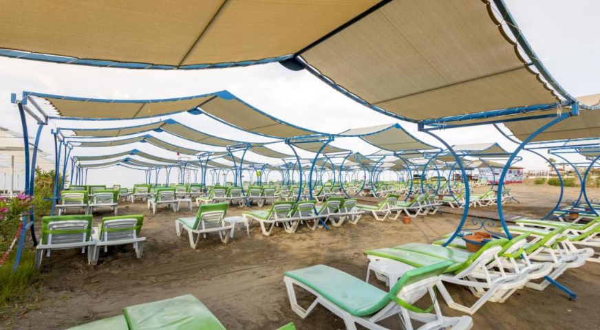 Собствен, на 400 м. от хотела, пясъчно-чакълест през подлез. Безплатен шатъл до плажа (по разписание). Чадъри и шезлонги на плажа и при басейна - безплатно. Плажни кърпи – срещу депозит.