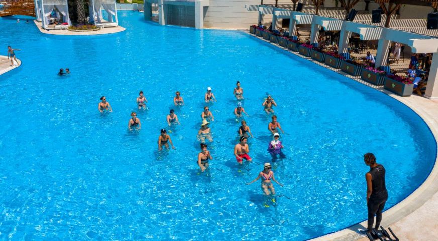 Безплатни услуги: Сауна, турска баня, парна баня, зона за релакс, фитнес, мини футбол, баскетбол, тенис корт, тенис на маса, плажен волейбол, водно поло, водна гимнастика, дартс, боча, билярд, бадминтон, табла, танци, табата, йога, стречинг, пилатес, степ зумба, канго джъмп, спортни тренировки, звукова терапия, жива музика, анимация, Wi-Fi (на цялата територия).