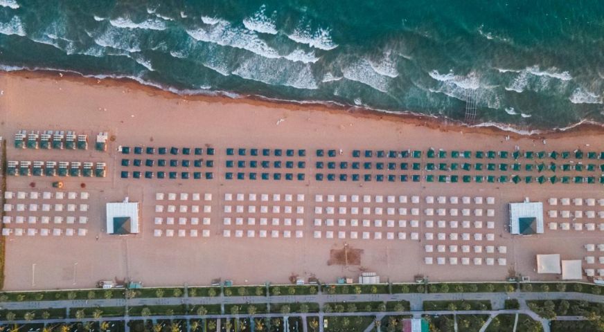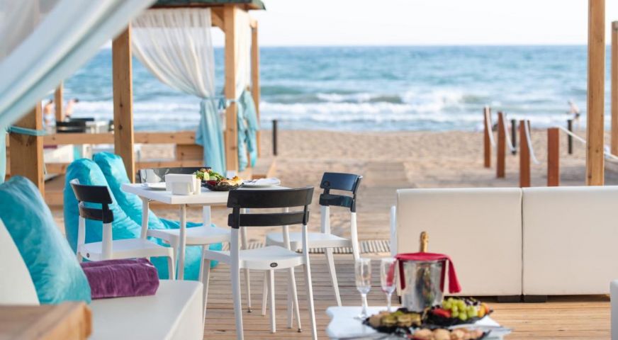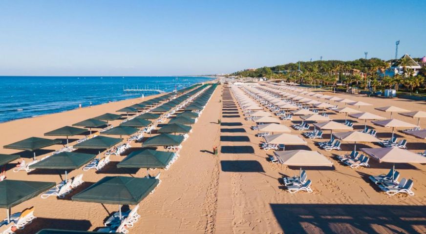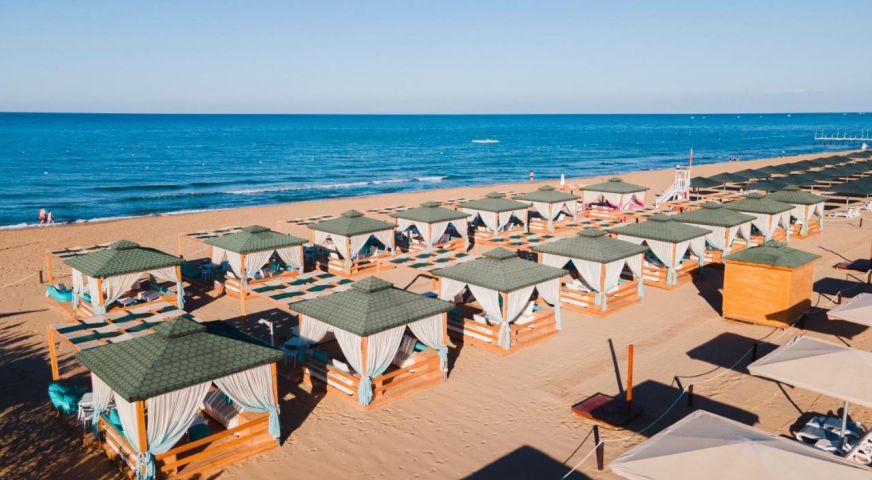 Собствен, пясъчен, с дължина на плажната ивица 500 м. Чадъри, шезлонги, матраци и плажни кърпи на плажа и при басейна - безплатно.