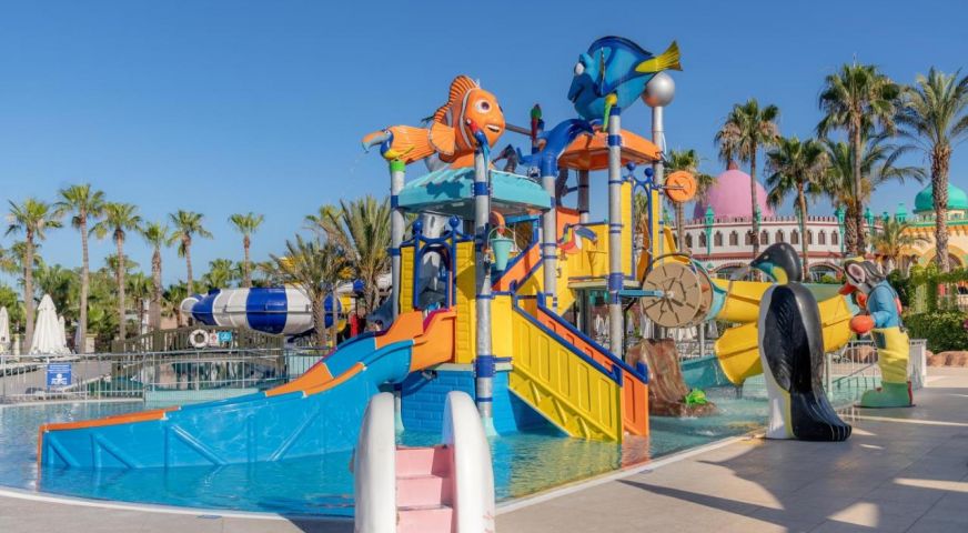 За децата: Мини клуб (4-12 г), тийн клуб (13- 17г), 3 открити и 2 закрити детски басейна, аквапарк, детско меню, детска площадка, лего стая, PlayStation конзола, мини зоологическа градина, детски активности, мини диско, мини кино, игрална зона, тематични дни, детска анимация, столче за хранене, бебешка количка и детегледачка – срещу заплащане.
