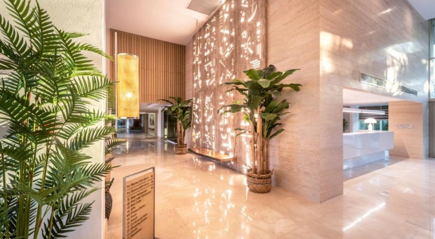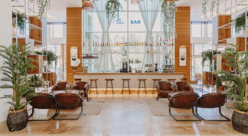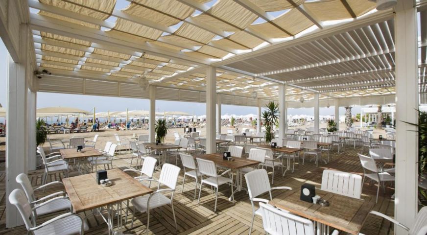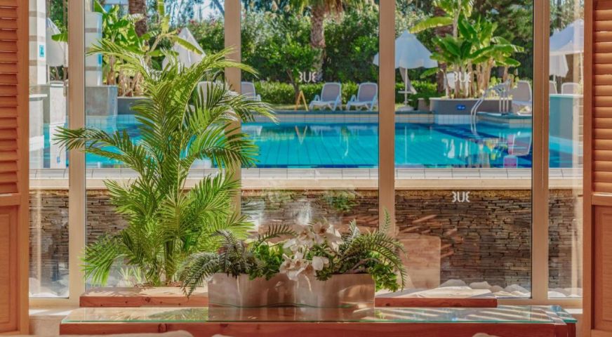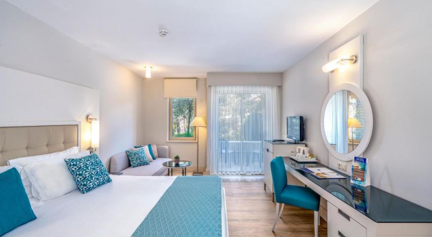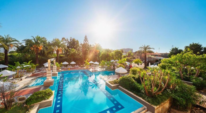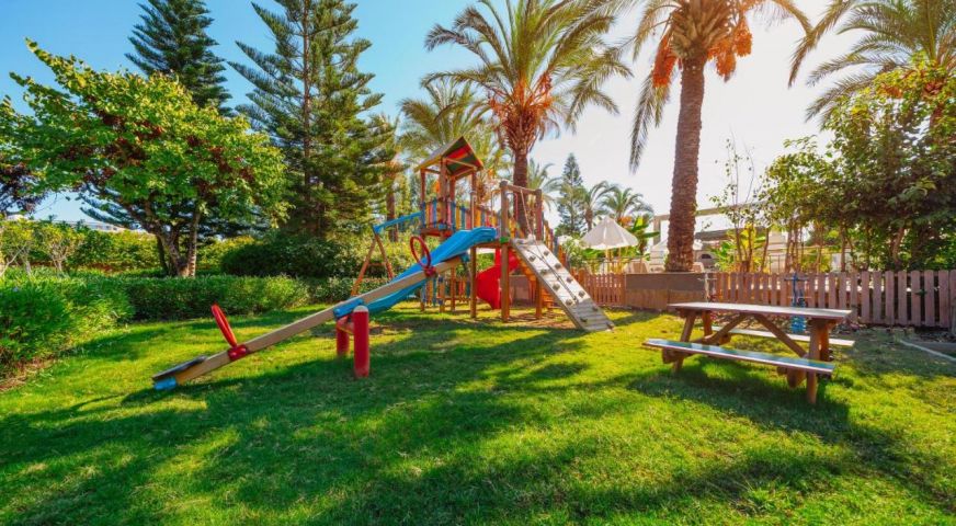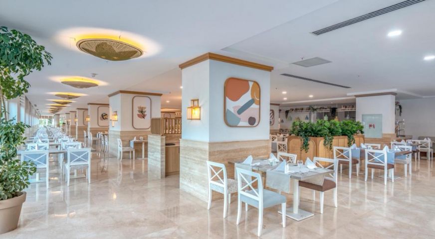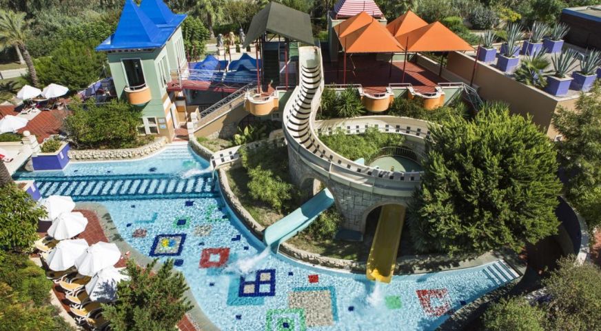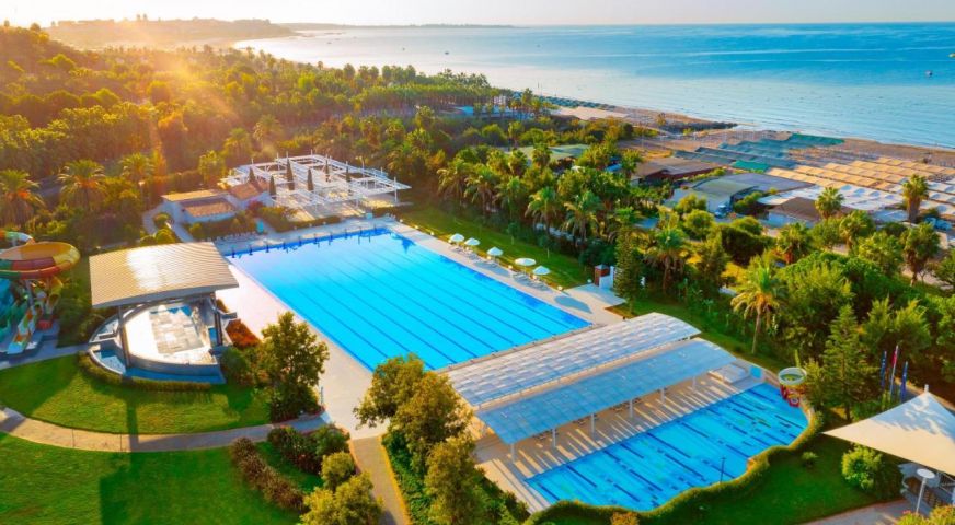 Основен ресторант, 3 A la carte ресторанта, 3 бара, 4 конферентни зали, 3 басейна (1 закрит и 2 открити), 3 водни пързалки, тенис на корт, салон за красота, СПА център, лекар, интернет в лобито на хотела (безплатно). Безплатни услуги: фитнес център, сауна, турска баня, тенис на корт, ракети за тенис, тенис на маса, билярд, дартс, шах, баскетбол, волейбол, плажен волейбол, кану, аеробика, мини голф, дискотека, анимация. Платени услуги: масаж, джакузи, солариум, езда, водни ски.