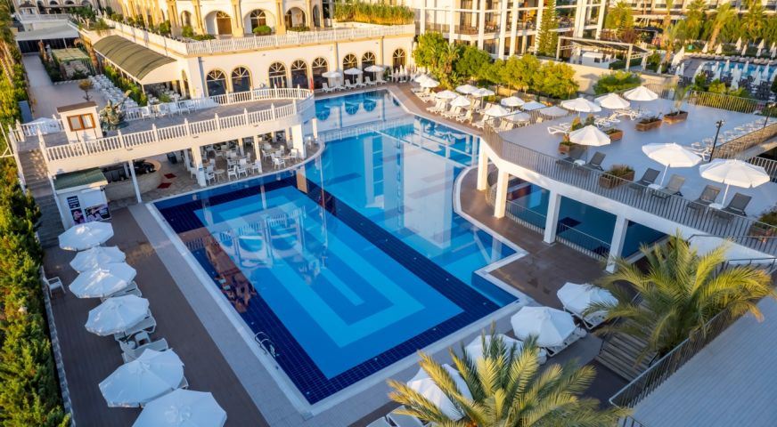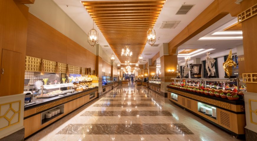 Основен ресторант, 4 а-ла-карт ресторанта (с предварителна резервация - италиански, далекоизточен и османски; мексикански - с доплащане), 7 бара, сладкарница, 2 открити басейна, закрит басейн, водни пързалки, магазини, СПА център, фитнес център, дискотека, паркинг, конферентни зали, WI-FI. За децата: детско меню, детски басейн, водни пързалки, детска площадка, мини клуб (4-7 г.), младежки клуб (8-12 г.), детско кино, мини диско, анимация. Безплатни услуги: сауна, турска баня, парна баня, фитнес, дартс, тенис на маса, плажен волейбол, мини голф, аеробика, водна аеробика, босиа, йога, мини библиотека, анимация, WI-FI. Платени услуги: масаж, фризьор, магазини, игрална зала, компютърни игри, билярд, химическо чистене, лекар, детегледачка, интернет кафе, уроци по сърф, водни спортове.