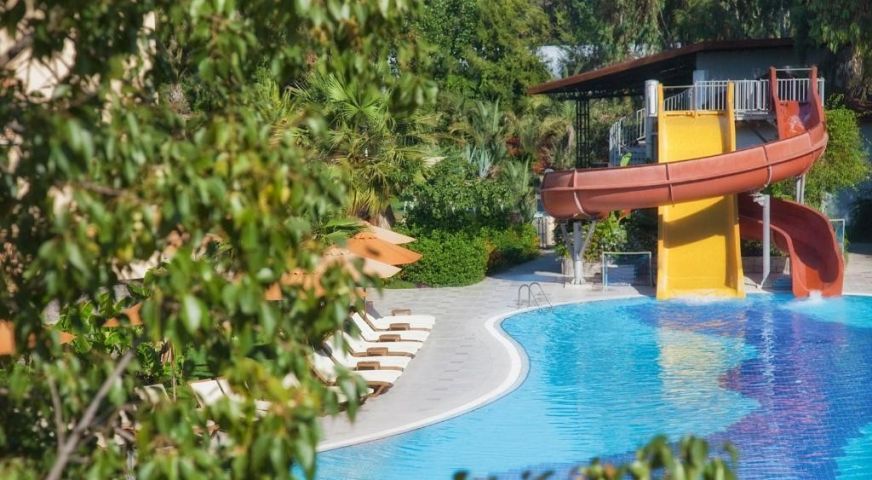 На територията на хотела: Основен ресторант, 2 бара, 2 басейна, 2 водни пързалки, 4 конферентни зали За децата: мини клуб (4-12г.), детски басейн, детегледачка(заплаща се допълнително). Безплатни услуги: фитнес център, тенис на маса, дартс, анимация Платени услуги: сауна, турска баня, масаж, сейф, телефон, факс, фризьор Плаж: пясъчно - каменист, на 350м. от хотела. Чадъри, шезлонги и плажни кърпи - безплатно.