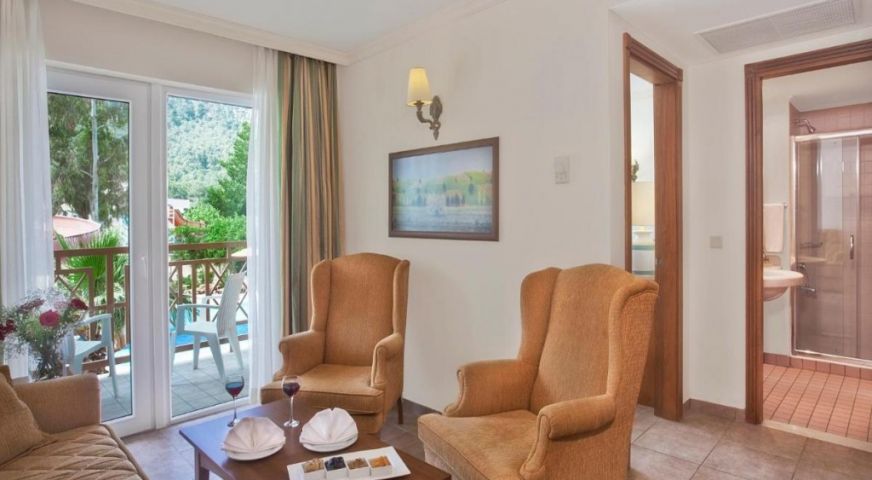 FAMILY SUITE: 45-50 м², просторно студио, двойно легло и разтегателен диван, 1 баня, балкон, изглед градина/басейн, максимално настаняване - 4 души.