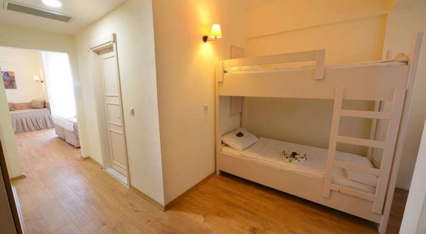 Family Room in Main Building – Фамилна стая в основната сграда – едностайно помещение, предлагаща изглед към земя, път или градина.  Състои се от 2 отделения, но без свързваща помежду им врата и има двуетажно легло. Подовата настилка е ламинат, а квадратурата на помещението е 33-35 м². В стаята има баня с душ, огледало, LCD телевизор със сателитни канали, сейф, сешоар, телефон, централен климатик, минибар (само с вода - безплатно), безплатен Wi-Fi, балкон.