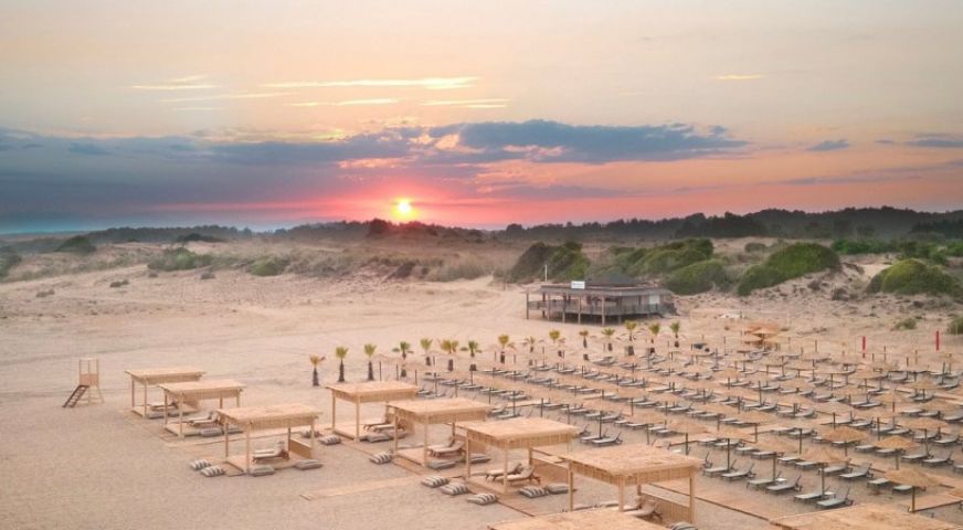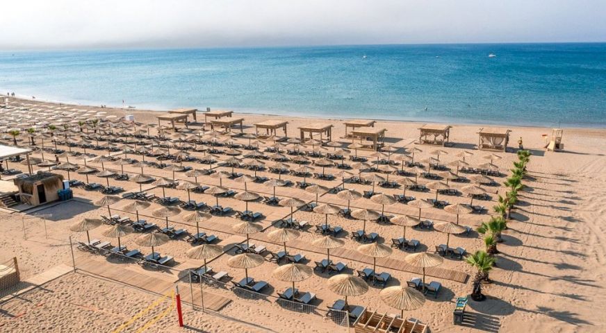 Собствен, пясъчен, на 250 м от основната сграда на хотела. Осигурен е безплатен шатъл транспорт за гостите. Чадъри, шезлонги и плажни кърпи на плажа и при басейна - безплатно.