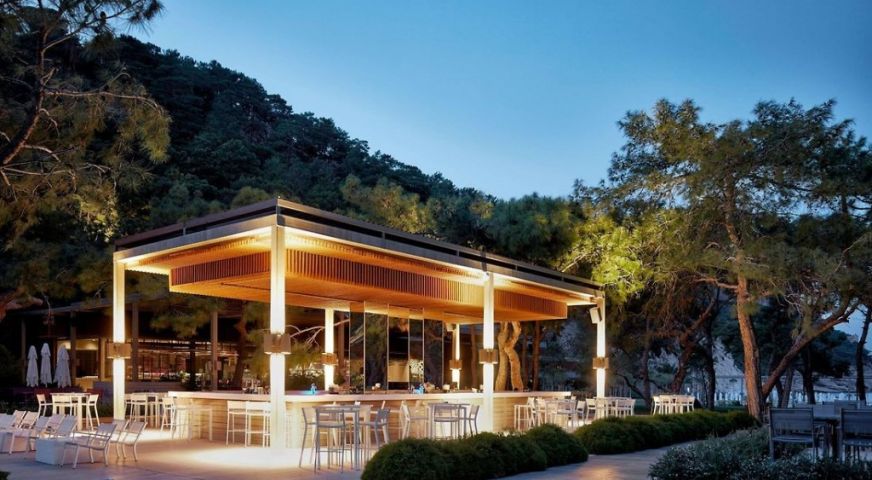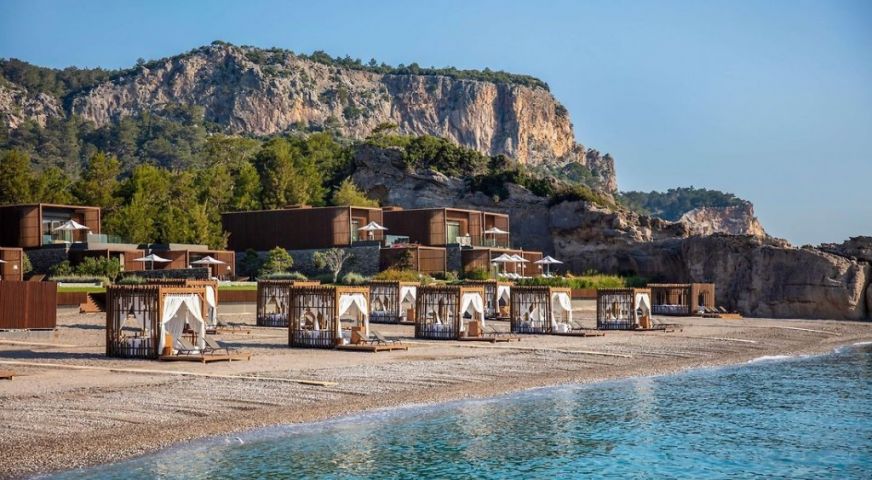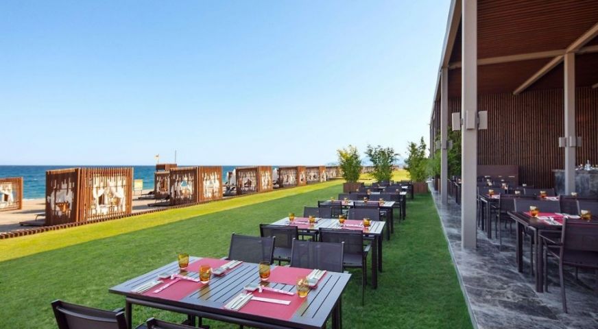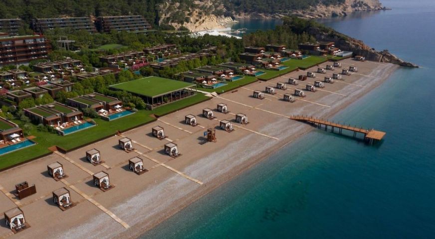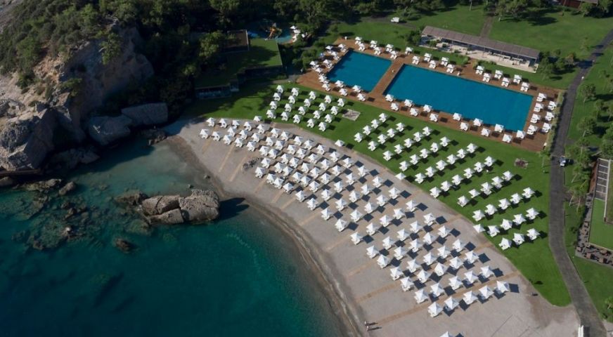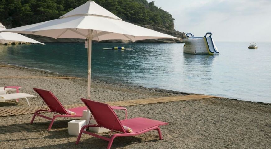 Плаж: На територията на хотела (100 м от основната сграда) се намира частен плаж с малки камъчета. Два частни 200-метрови залива, 400-метров частен плаж, 30-метров плаж за деца. Шезлонги, чадъри, матраци, плажни кърпи са безплатни. Входът към морето е малко камъче. Кабини за преобличане, душ, спасител на плажа, бар. Частните павилиони са платени. Обслужване на хладни кърпи и бърсане на слънчеви очила на плажа (безплатно).