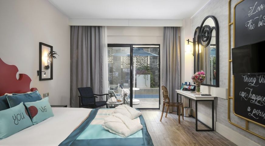 Хотелът разполага с общо 322 стаи, от които 119 стандартни стаи Standart room (изглед суша, изглед море, изглед басейн - 32 м.), 10 Swim up стаи (изглед басейн - 32 м.), 16 Suites (изглед море, изглед басейн - 42 м.). Всички стаи са оборудвани с климатик , телевизор, телефон, баня/душ, сешоар, минибар (минерална вода), сейф (срещу заплащане), сет за кафе/чай, балкон.