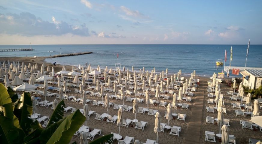 Собствен, пясъчен, със сертификат Син флаг. Чадъри, шезлонги и матраци на плажа и при басейна - безплатно.