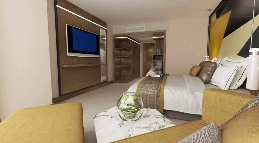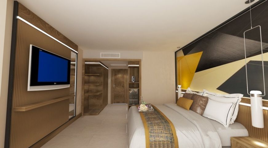 В стаите: Едно от предимствата на хотела са неговите широки луксозни стаи с площ от 32 m², всяка от които е оборудвана с двойно легло и разтегателен диван, климатик, 43-инчов LED телевизор със сателитен приемник, телефон с директно избиране, баня с душ или вана, халат и чехли за баня, сешоар, минибар, електронен сейф, сет за приготвяне на чай и кафе, балкон, безжичен интернет.Ежедневно презареждане на минибара с вода, сокове, газирани безалкохолни напитки и бира.