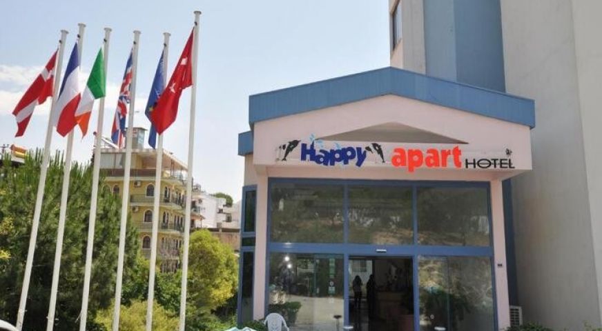 Happy Apart Hotel е семеен комплекс, реновиран през 2015 г. Предлага настаняване с възможност за самостоятелно готвене и пране. Комплексът е разположен около голям басейн със снек-бар край него. Намира се на тихо място в района на Дамския плаж, само на 250 м от самия плаж. Модерните апартаменти имат голяма дневна зона с отворен план и кухненски бокс и отделна спалня с 2 отделни легла. Облицованите с керамични плочки бани са оборудвани с душ, мивка и тоалетна. Хотелът разполага с тераса за слънчеви бани с LED осветление. За комфорта на гостите са предоставени шезлонги и градински възглавници. Съоръженията на комплекса включват плувен басейн с детски сектор, обширни градини и минимаркет.