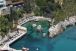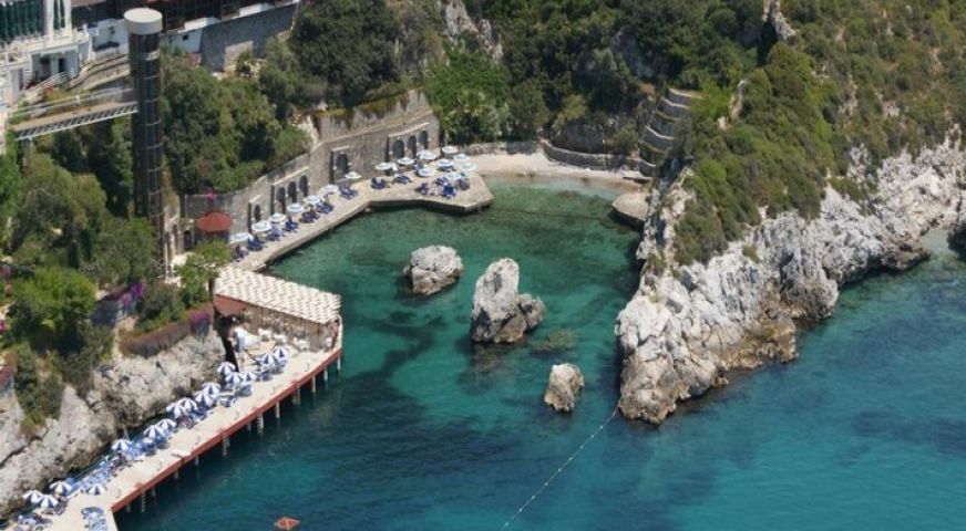 Собствен, пясъчно-чакълест и платформа в малък живописен залив. Достъпът до плажа е по стълби / с асансьор. Чадъри, шезлонги, матраци и кърпи – безплатно
