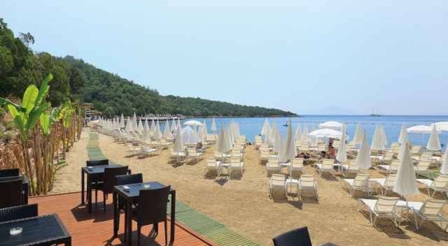 Собствен - пясъчен. Чадъри, шезлонги на плажа и при басейна - безплатно.