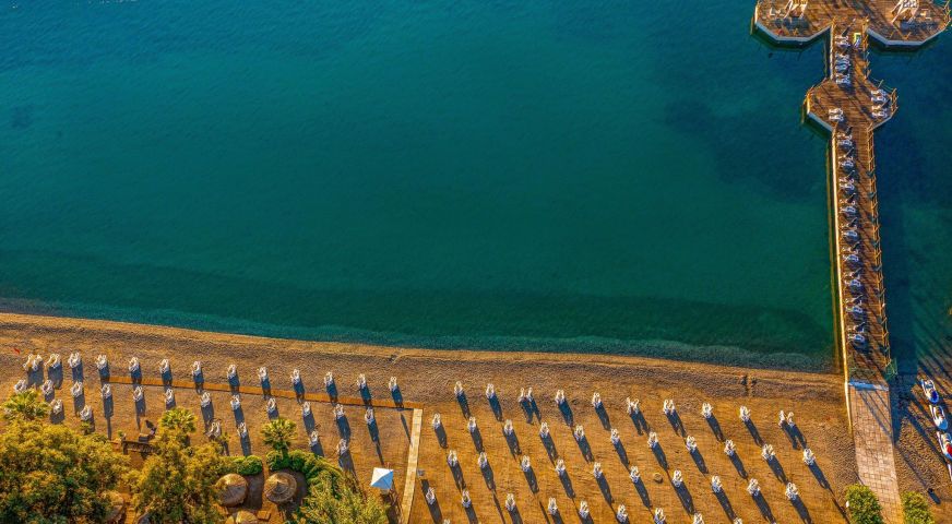 Собствен, пясъчен - чадъри и шезлонги на плажа и при басейна - безплатни.