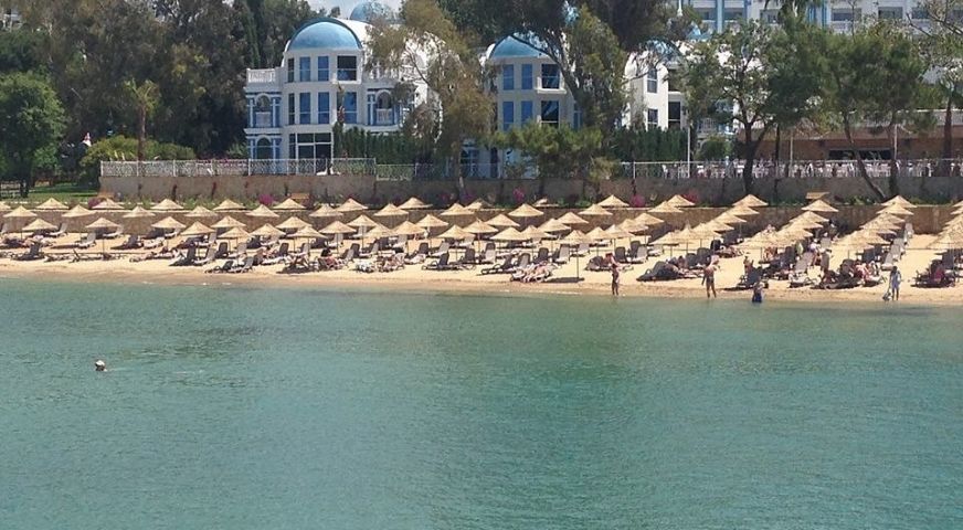 Собствен, пясъчен с дължина 120 м., притежаващ сертификат "Син флаг", платформа. Чадъри, шезлонги, матраци и плажни кърпи на плажа и при басейна - безплатно.