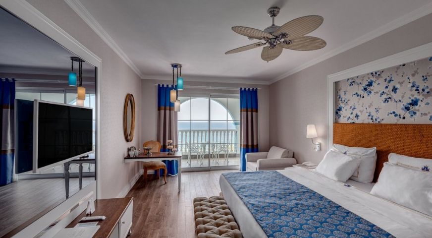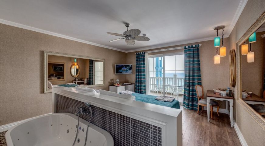 Стаи Main Building: Deluxe room (30 - 32 м2), Deluxe pool room (30 - 32 м2), Superior room (35 м2), Junior Suite room (1 спалня, 1 баня - 40 м2 ) Superior suite room (2 спални, 1 баня - 57 м2), Villa suite room (2 спални, 2 бани ( В деня на пристигане се предоставят плато с плодове и вино) - 62 м2), King suite room (2 спални, 2 бани + външно джакузи, мека бел, чадър и шезлонги (В деня на пристигане се предоставят плато с плодове и вино) – 64 - 80 м2)