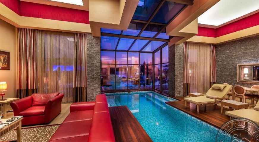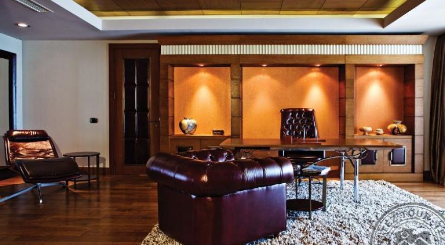 Presidential Suite (гледка към морето, разположен на последния етаж, хол, трапезна зона в залата за коктейли и прием, работен кабинет, кухня, вътрешен басейн с джакузи, сауна, фитнес-кът, 3 спални с врати (едната от тях за персонала), 4 бани: една с джакузи, гледка към морето, останалите с вана и душ, балкон и 2 тераси, макс. 6 чов., 700 м2,