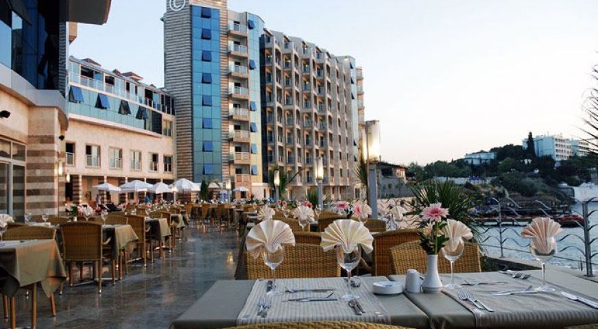 На 75 км от летището в гр. Измир, 500 м от центъра на Кушадасъ, на брега на морето със собствен каменист плаж. Открит през 2006 г.