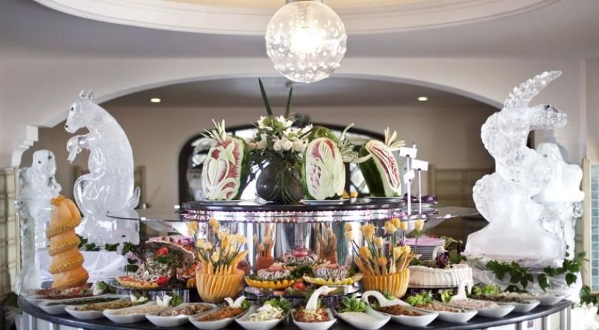 - 12 ресторанта а ла карте (средиземноморски - с предварителна резервация, за целия престой посещение на 1 ресторант - безплатно/мин. 5 нощувки; италиански, френски, мексикански, руски, индийски, японски, суши - платено; в хотел Sunrise Park Resort & SPA: барбекю, рибен, монголски, турски - платено)