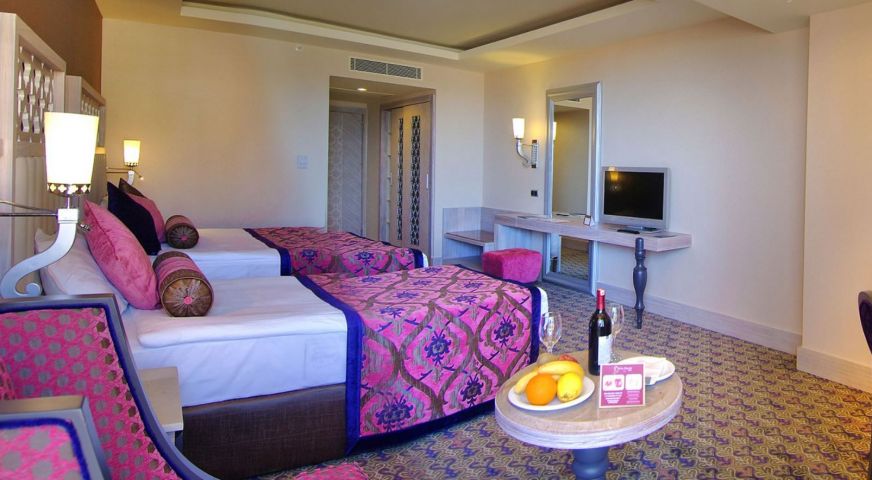 На територията на хотела има основен ресторант, диетично меню, 5 ресторанта a la carte (турски, далекоизточен, италиански, рибен, мексикански – с предварително записване, за едноседмичен престой посещение на един от ресторантите 1 път – безплатно), 8 бара