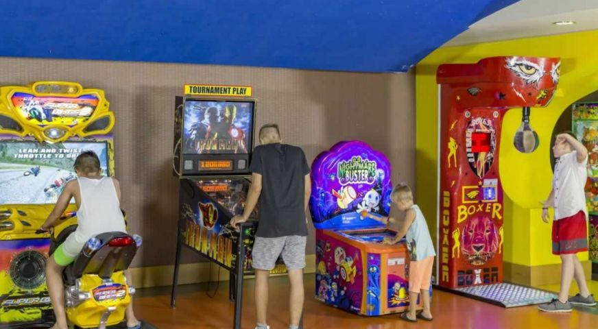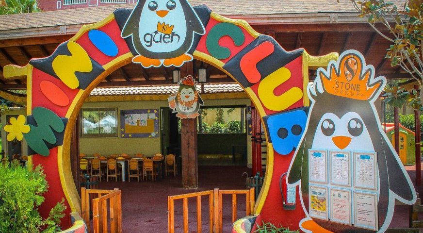 За децата: Детско меню, детски площадки, мини клуб (4-12 г.), 2 детски басейна, водни пързалки, мини дискотека, анимация, лунапарк, зоопарк.