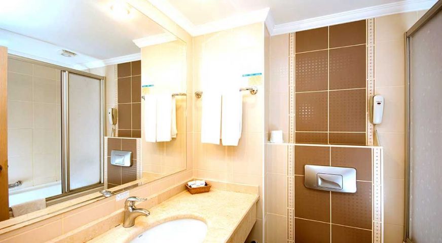 баня с вана, баня с душ (в 2-те стаи за инвалиди), сешоар, индивидуален климатик, телевизор, телефон, мини-бар (ежедневно се зарежда с вода, безплатно), сейф (в стаите, срещу заплащане), под - мокет, балкон, почистване на стаите - ежедневно, смяна на спалното бельо - 2 пъти седмично
