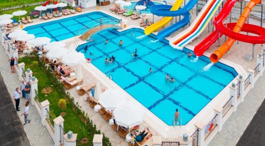 Основен ресторант, 2 бара, открит басейн,закрит басейн, водни пързалки, аквапарк, магазини, СПА център, дискотека, кино, амфитеатър, паркинг.