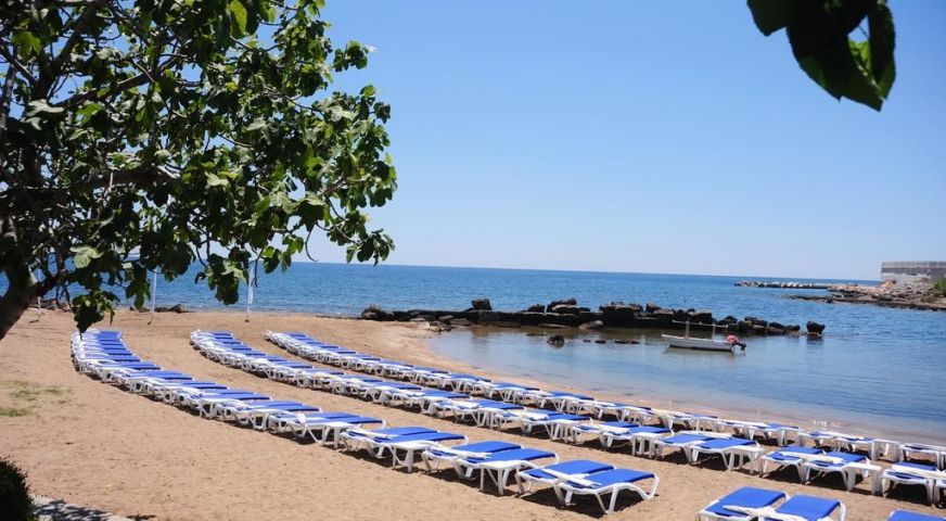 Собствен, платформа и пясъчно - чакълест. Чадъри, шезлонги и матраци на плажа и при басейна – безплатно, плажни кърпи – безплатно.