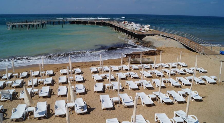 Собствен, пясъчен. Чадъри, шезлонги и матраци на плажа и при басейна – безплатно, плажни кърпи – срещу депозит.