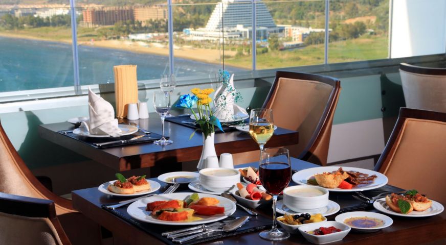 Хотелът разполага с 2 основни ресторанта, 6 a la carte ресторана (турски, средиземноморски, интернационален, азиатски, италиански и морски – с предварително записване, за едноседмичен престой еднократното посещение е безплатно, деца до 12 год. не се допускат), 6 бара, 2 открити басейна, закрит басейн (през юли и август не работи), ТВ зала, лекарски кабинет, фризьорски салон, пране, химическо чистене, обмяна на валута, наем на автомобили, паркинг, конферентна зала (за 200 чов.)
