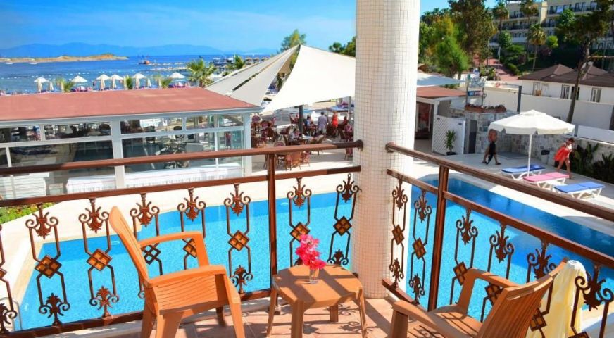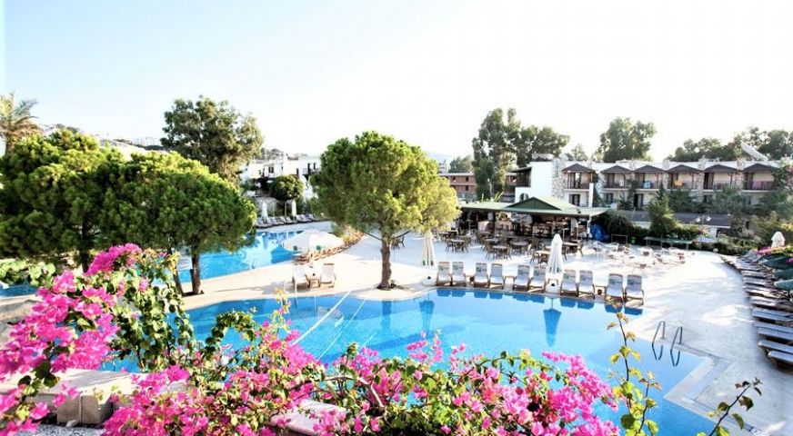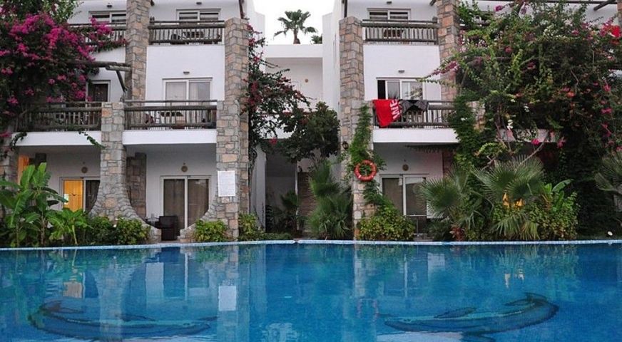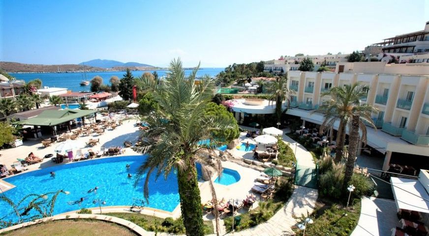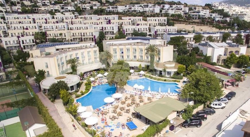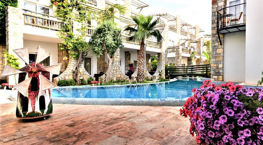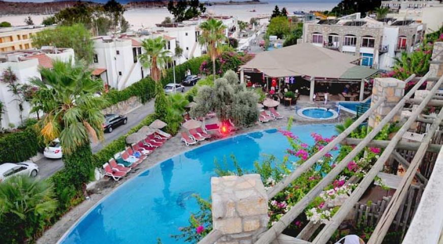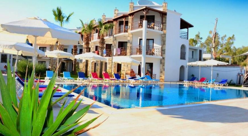 на 3 км. от Бодрум в центъра на Гюмбет, на брега на морето и 38 км. от летище Бодрум