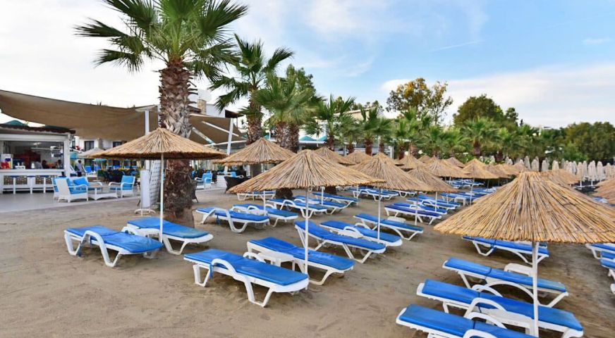Собствен пясъчен с безплатни шезлонги, чадъри, матраци и кърпи.