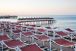 Пясъчен плаж. Чадъри, шезлонги плажни кърпи на плажа - безплатно.