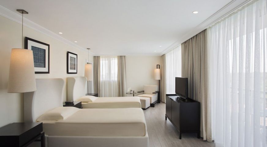 баня с вана, сешоар, халат, чехли, централен климатик, телевизор, телефон, мини-бар (безалкохолни напитки, бира – зареждат се ежедневно, безплатно), сейф (безплатно), подова настилка - мокет, балкон, безжичен интернет (ниска скорост, безплатно), ежедневно почистване на стаята, смяна на спалното бельо - 3 пъти седмично, room service (24 часа, платено)