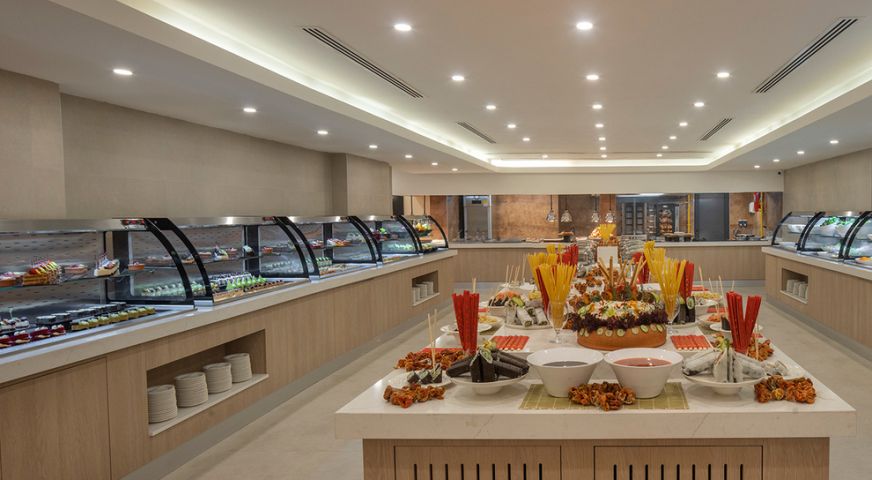 Ultra All Inclusive. На разположение на гостите има основен ресторант. Освежаващи напитки и закуски се поднасят в сладкарница, лоби бар, лаундж бар, бар при басейна, плажен снек бар.