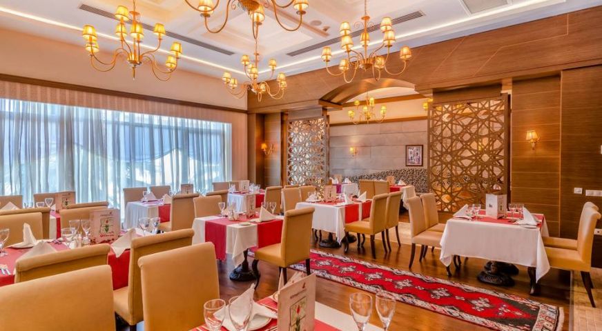 Основен ресторант, диетично меню, вегетарианско меню, 3 ресторанта а`ла карт (китайски, средиземноморски и турски – с предварително записване, за едноседмичен престой посещението на един ресторант един път е безплатно), 7 бара.