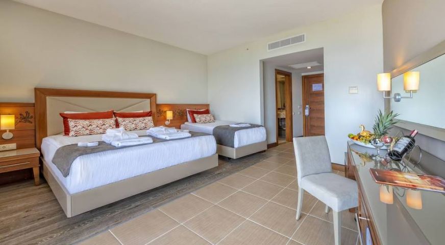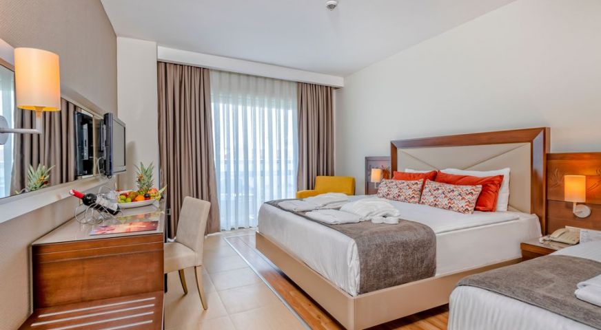 Хотелът се състои от един 5-етажен корпус (138 стаи с изглед море и 104 стаи с изглед към пътя и градината), 193 standard room (от тях 5 стаи за инвалиди, макс. 3+1 чов., 37 м2); 65 двустайни family room (2 спални с врата, 2 TВ, 2 мини бара, макс. 4 чов., 45 м2); 32 едностайни junior suite ( макс. 3+1 чов., 40 м2).В стаите има баня с вана, сешоар, централен климатик (работи в определени часове), плазмен телевизор, телефон, мини бар (вода и безалкохолни напитки се попълват ежедневно, безплатно) сейф (платено), под – ламинат, керамични плочки, балкон. Почистване на стаите – ежедневно, смяна на спално бельо – 2 пъти седмично.