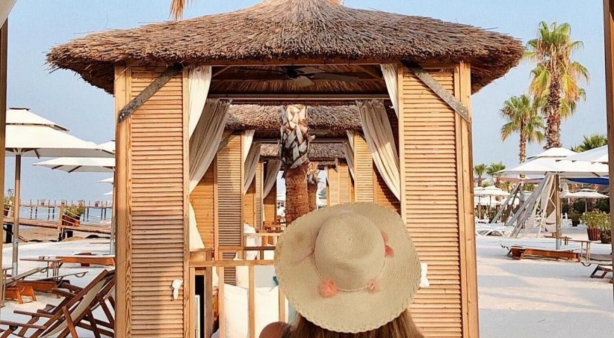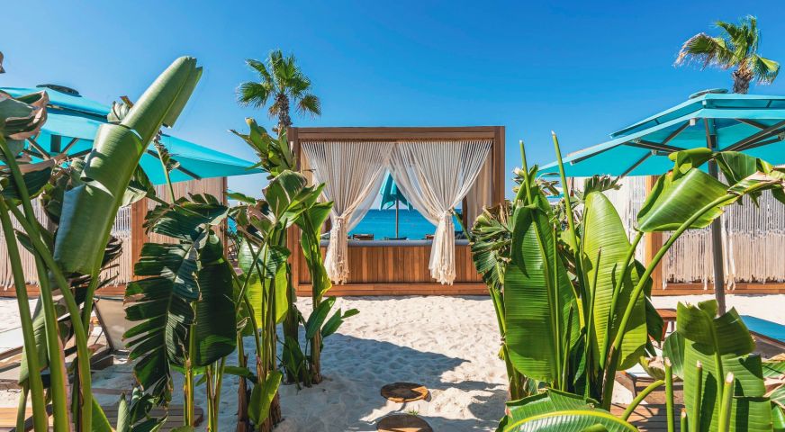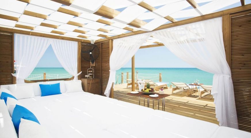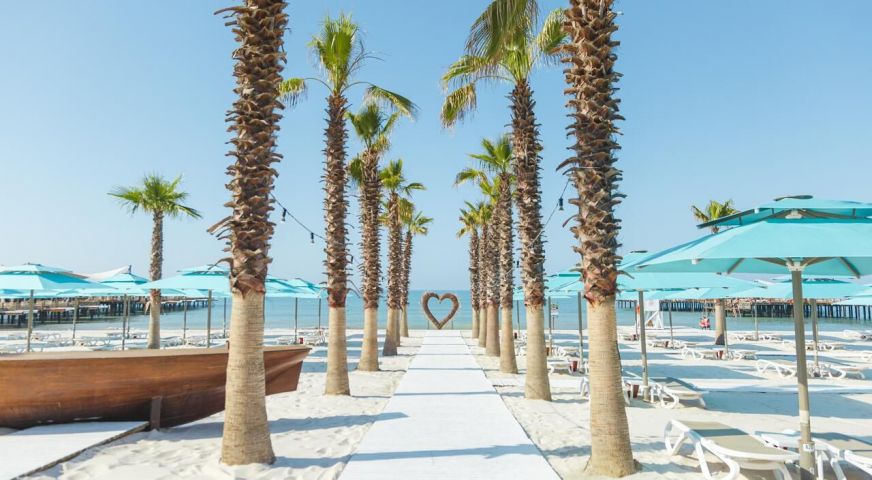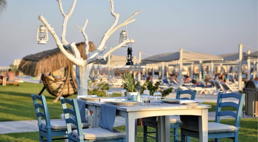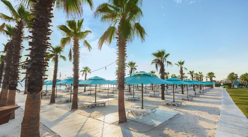 Собствен, бял пясък. Бар на плажа: безплатно. На плажа: чадъри, шезлонги, матраци, кърпи - безплатно, шатри - платено. На басейна: чадъри, шезлонги, матраци - безплатно.