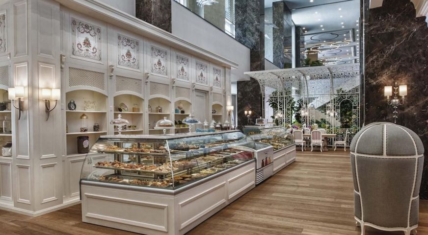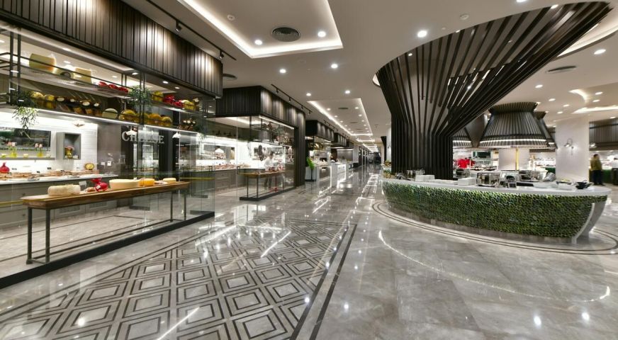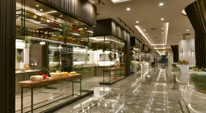 2 ресторанта (единия от тях е за гости над 15 год.), 4 ресторанта a-la-carte (турски, италиански, далекоизточен, рибен, с предварителна резервация, резервацията се заплаща)