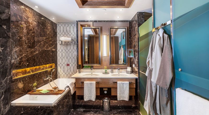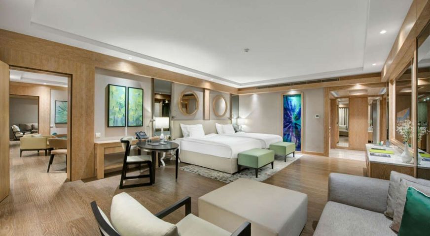 2 тристайни Presidential Suitе room sea view (хол с мека мебел, 2 спални с врата, 2 бани: 1 с джакузи и душ, 1 само с душ, голям балкон, макс. 4+1 чов., 150 м2, VIP-обслужване)