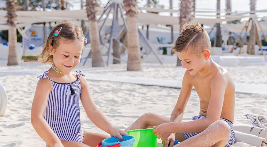 детска количка - депозит, детска площадка, 1 детски басейн, детско меню - безплатно (обяд и вечеря), 4 водни пързалки, тийнейдж клуб - безплатно (13-17 год.), детегледачка - платено, детски клуб (мини-клуб (4-6 год.), джуниър клуб (7-12 год.), FC Chelsea Academy
