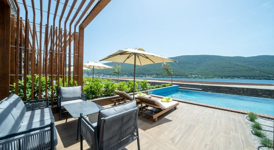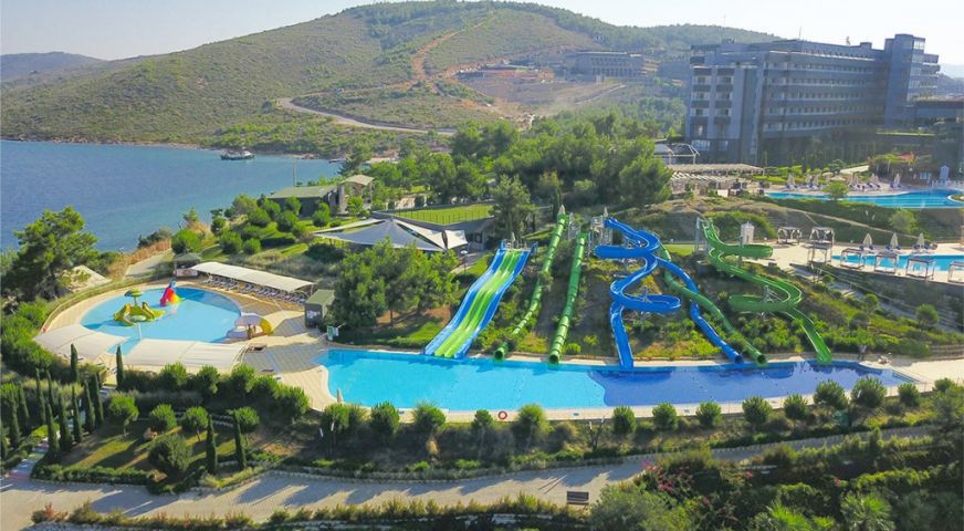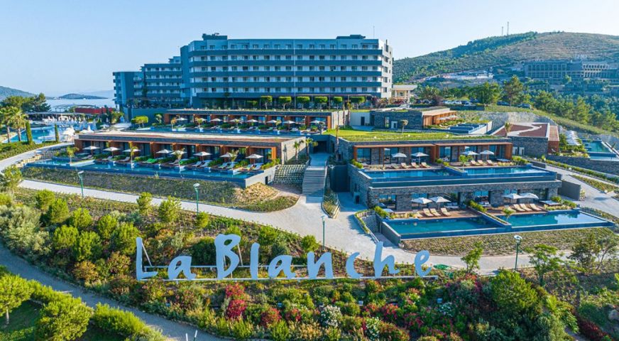 La Blanche Island се намира в уединен и много красив район на крайбрежието на Гюверджинлик с обща площ от 82 000 m². Включва собствена пясъчна ивица от общо 1200 м, и aква парк. Летище Милас Бодрум е на 15 км. Пред хотела има спирка за градски транспорт. Реновация през 2023/4 г на ресторантите, общите части и подобрена Ultra All Inclusive концепция.