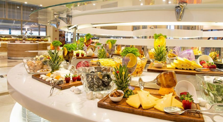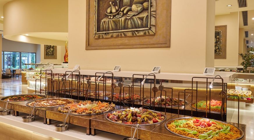 Основен ресторант PINA с диетичен, вегетариански и детски кът; 5 а-ла-карт ресторанта (турски MARDIN, средиземноморски VIRA, италиански PULCINELLA, далекоизточен SAKURA, тепаняки SHIMA - необходима е предварителна резервация. На престой се предоставя безплатно 1 а-ла-карт ресторант по избор / изключение на SHIMA Tappanyaki Restaurant; 4 снек ресторанта (Mexican, Vira, Sunrise, Sakura); 15 бара - Sunset Lobby Bar, Sunrise Pool Bar, Vira Pier Bar, Pavillion Bar, Begonvil Bar, Private Bar, Pina Beach Bar, Disco Bar, Mexican Bar, Sakura Bar, Pool Bar, Starbucks, Kids Bar, 3 станции за турски специалитети, 1 сладкарница, диетично и вегетарианско меню, детско меню.