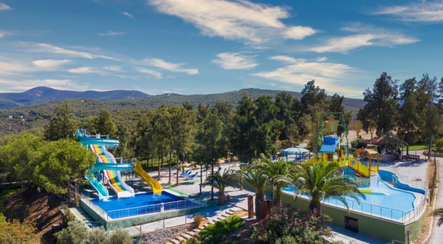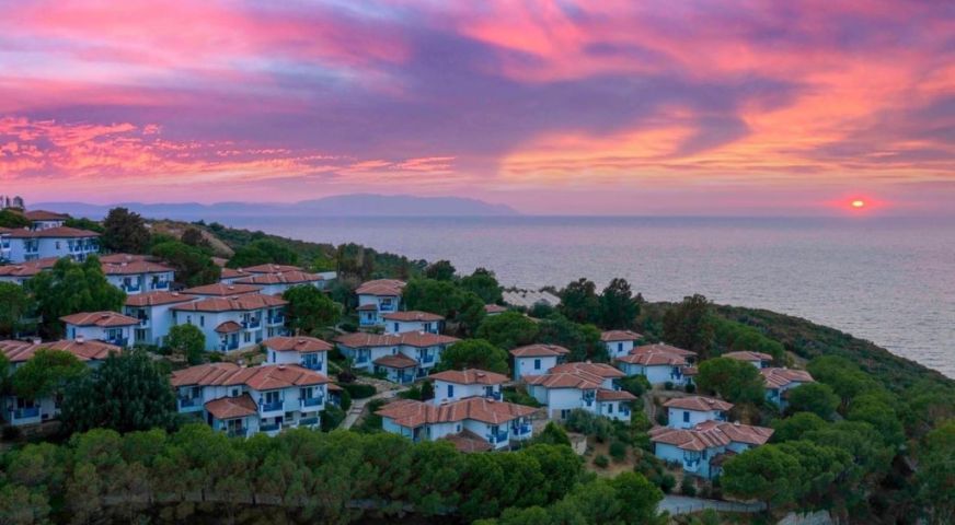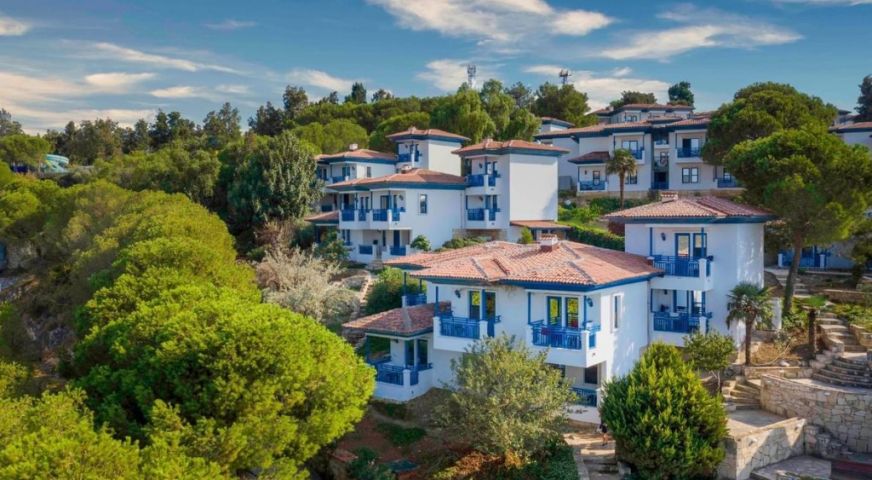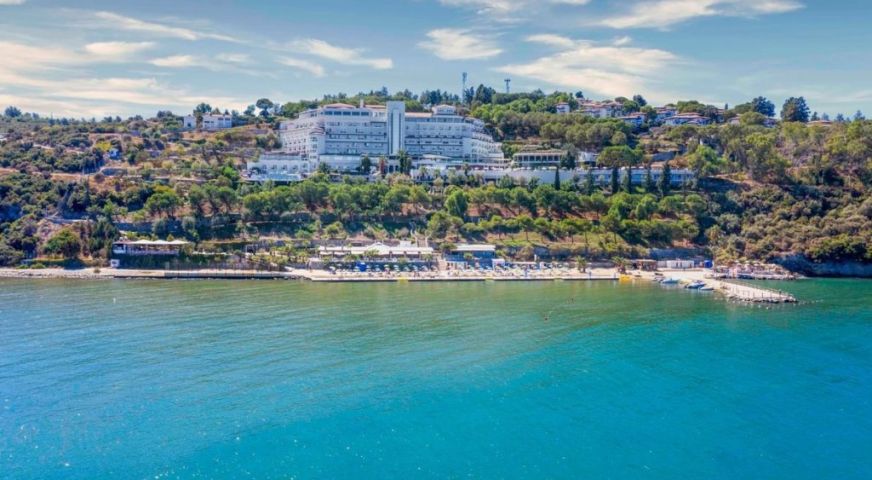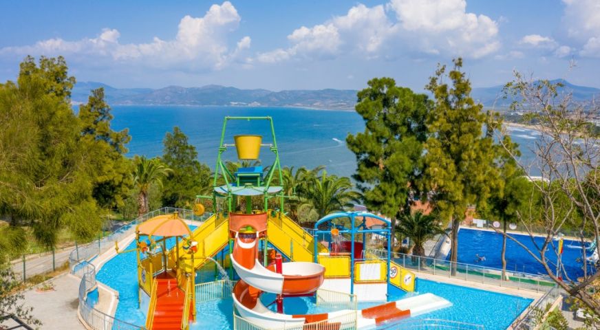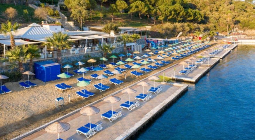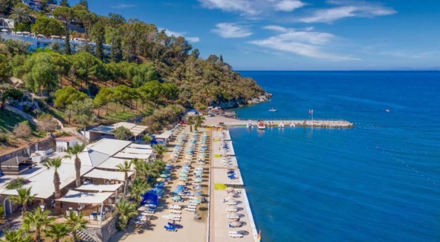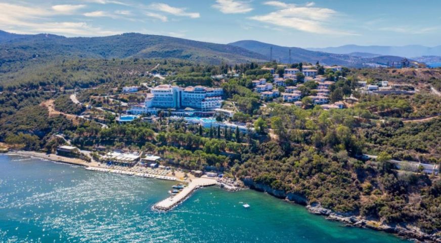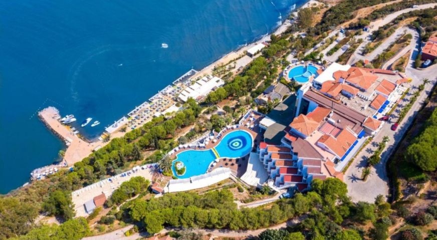 Разположение: Хотелът е разположен на хълм, заобиколен от тучна зелена природа от борове и палми с фантастична гледка към тюркоазеното Егейско море върху територия с обща площ от 140000м2. Намира се на 140 км от летище Милас-Бодрум, на 9 км от центъра на Кушадасъ и на около 10 км от античния град Ефес, на брега на морето.
