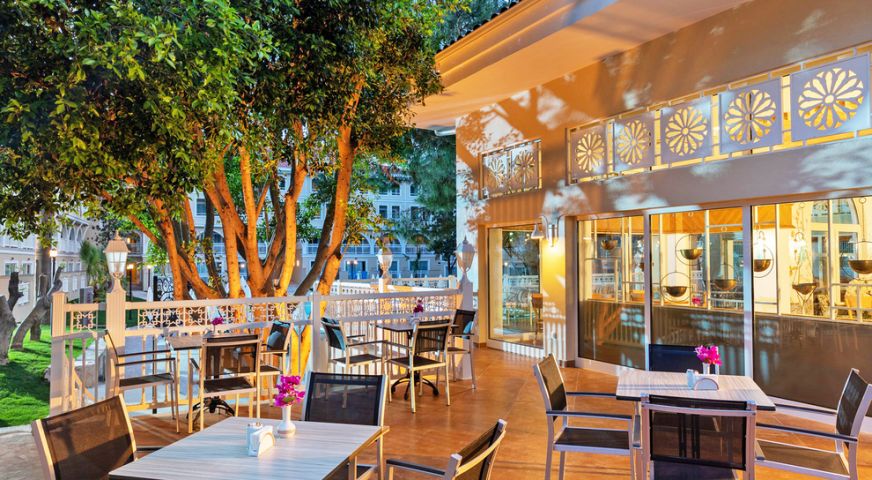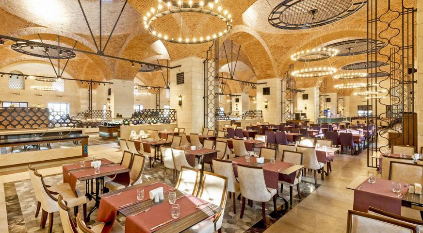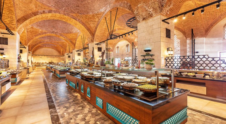 На разположение на гостите са основен ресторант, 3 а`ла карт ресторанта (2 турски и 1 интернационален – срещу заплащане и с предварителна резервация, съгласно концепцията на хотела), снек ресторант, сладкарница. Освежаващи напитки и закуски се поднасят в 12 бара.