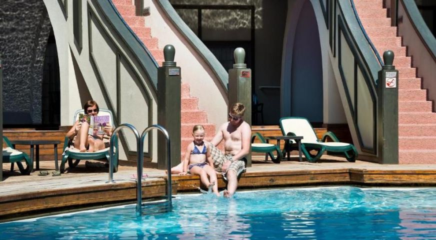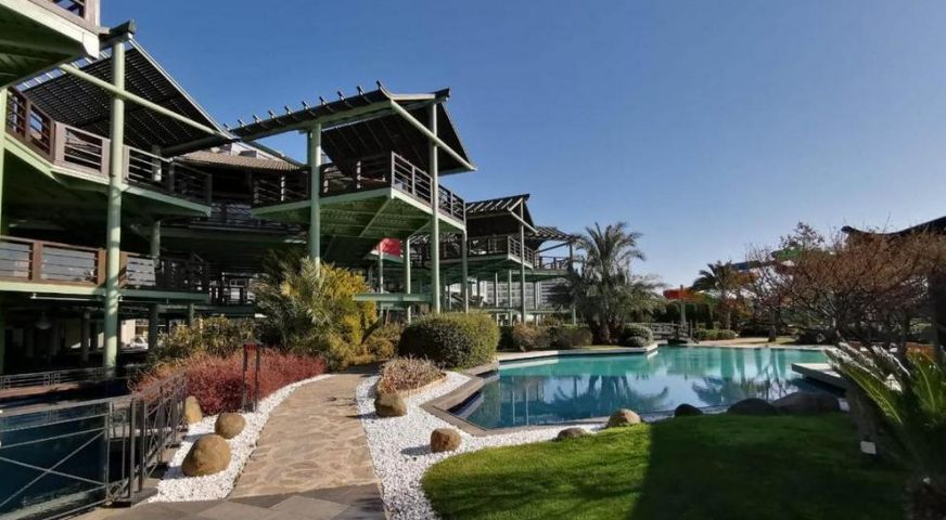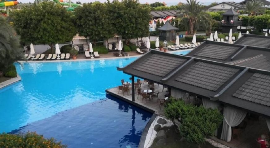 Собствен пясъчен плаж, дълъг 100 м, с кей. На разположение на гостите има четири открити басейна, 3 водни пързалки. Безплатен плажен бар, чадъри, шезлонги, матраци и кърпи – безплатно. Шатри – срещу заплащане. На басейна - чадъри, шезлонги, матраци – безплатно.